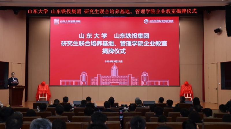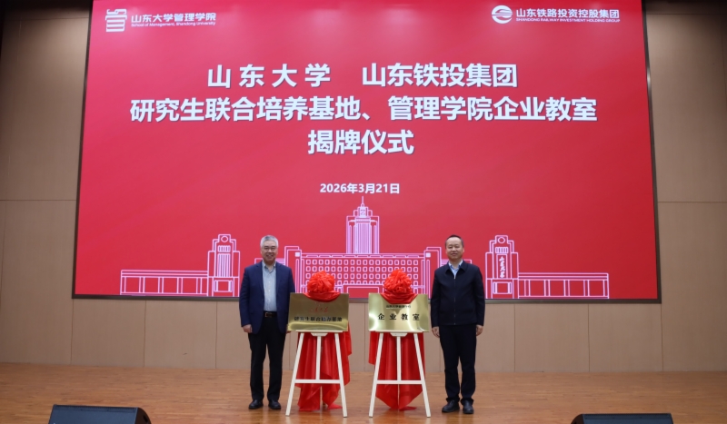 3月21日上午,山東大學、山東鐵投集團研究生聯(lián)合培養(yǎng)基地及管理學院企業(yè)教室揭牌儀式在濟南舉辦,旨在深化產(chǎn)教融合、推動校企合作,為協(xié)同推進人才培養(yǎng)、科研攻關、成果轉(zhuǎn)化搭建專業(yè)平臺。山東鐵投集團黨委書記、董事長王衛(wèi)中,黨委副書記、董事樂江華;山東大學財務部部長路軍偉,管理學院黨委書記付巖志、院長丁榮貴出席儀式。