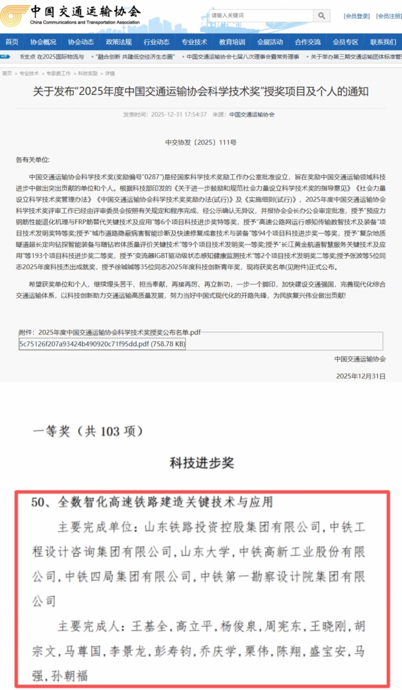 山東鐵投集團(tuán)成果榮獲2025年度中國(guó)交通運(yùn)輸協(xié)會(huì)科學(xué)技術(shù)獎(jiǎng)一等獎(jiǎng)、中國(guó)鐵道學(xué)會(huì)科學(xué)技術(shù)獎(jiǎng)一等獎(jiǎng)
