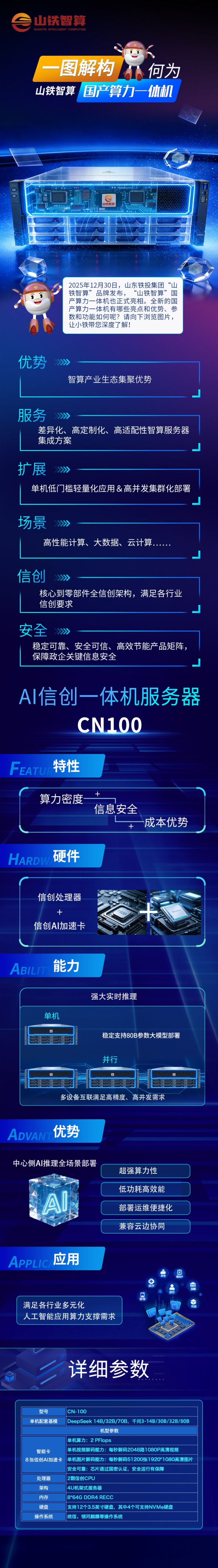 2025年12月30日,山東鐵投集團(tuán)“山鐵智算”品牌發(fā)布,“山鐵智算”國產(chǎn)算力一體機(jī)也正式亮相。全新的國產(chǎn)算力一體機(jī)有哪些亮點(diǎn)和優(yōu)勢、參數(shù)和功能如何呢?請向下瀏覽圖片,讓小鐵帶您深度了解!