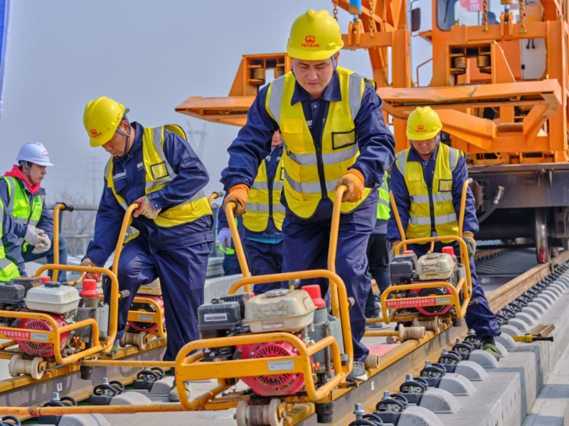 為保障鋪軌作業(yè)高質(zhì)高效推進(jìn),山東鐵投集團(tuán)權(quán)屬魯南高鐵公司會(huì)同中鐵四局精心組織、科學(xué)管理,投入運(yùn)輸、鋪軌、牽引等全套專業(yè)化機(jī)械設(shè)備共計(jì)百余臺(tái),施工效率全面提升。其中,WZ500無(wú)砟鋪軌機(jī)組單班日鋪軌可達(dá)6公里,YWQY100型牽引車集成履帶、輪胎和輪軌走行裝置,可無(wú)縫切換有砟、無(wú)砟軌道鋪設(shè)模式,確保各類線路作業(yè)連續(xù)、精準(zhǔn)、高效。