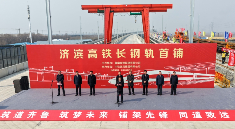 3月10日上午10時(shí)30分,濟(jì)濱高鐵首列長(zhǎng)鋼軌鋪設(shè)儀式在山東省濱州市濱州站建設(shè)現(xiàn)場(chǎng)舉行。山東鐵投集團(tuán)黨委書(shū)記、董事長(zhǎng)王衛(wèi)中出席鋪設(shè)儀式并宣布開(kāi)鋪。