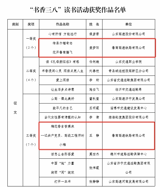 在“書香三八”讀書活動評選中,魯南公司袁夢陽同志《傳承巾幗奇志花開魯南騰飛》榮獲征文類一等獎;魯南公司王靜同志《梅花香自苦寒來--記共產(chǎn)黨員、高級工程師時小梅 》榮獲征文類三等獎;綜合開發(fā)公司李雅坤同志《爭做新時代的筑夢人》榮獲家書類二等獎;濟青公司集體創(chuàng)作《追夢新時代 巾幗綻芳華》榮獲表演閱讀類三等獎。