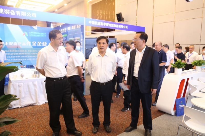 會議期間,黃民一行到集團展廳及會議現(xiàn)場展區(qū)參觀交流,集團推出的山東鐵路智能化建設(shè)管理平臺、CRTSⅢ型板式無砟軌道智能施工技術(shù)與裝備引得眾人關(guān)注。山東鐵路智能化建設(shè)管理平臺是以數(shù)字技術(shù)賦能高鐵智能化建設(shè)的重大成果,該平臺包含從設(shè)計到施工再到運營階段36個板塊、390多個功能模塊,實現(xiàn)了鐵路建設(shè)全生命周期管理,形成了“一張圖、數(shù)字化、智能化、可視化”的管理特色。平臺已在濟濱高鐵項目全面推廣應(yīng)用,取得了良好成效,累計產(chǎn)生數(shù)據(jù)量70余萬條,活躍用戶8000多人。CRTSⅢ型板式無砟軌道智能施工技術(shù)與裝備是指CRTSⅢ型板式無砟軌道“測量-調(diào)整-支護-灌注”一體化施工裝備,并與配套施工工裝之間無縫銜接,能夠提高施工效率50%以上,減少人力1/3以上,實現(xiàn)施工全過程質(zhì)量可控,并可拓展到其它類型無砟軌道施工中。