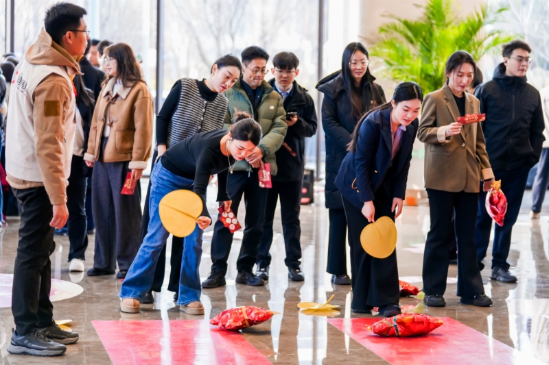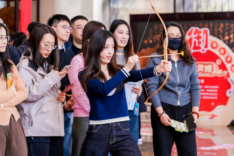 活動現(xiàn)場分為“君子六藝”游戲挑戰(zhàn)區(qū)與民俗集市區(qū)兩大板塊,東西兩側(cè)大廳功能鮮明、熱鬧非凡。游戲挑戰(zhàn)區(qū)設(shè)置了“禮、樂、射、御、書、數(shù)”即猜燈謎、聽曲識歌、扔沙包、射箭等6個趣味互動節(jié)目,廣大職工憑借通關(guān)卡參加趣味活動,每通一關(guān)可獲得一枚印章、相應(yīng)印章可兌換50貫“交子”,用“交子”在集市上購買心儀年貨。