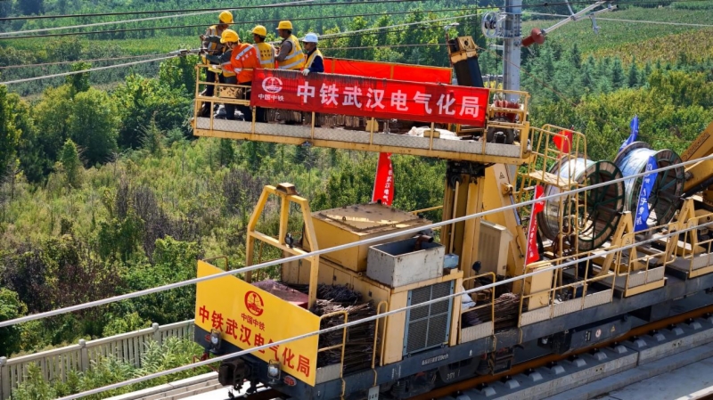 上午9時,在濰煙高鐵DK154+443施工現(xiàn)場,隨著現(xiàn)場負責人一聲令下,恒張力放線車緩緩啟動,在作業(yè)車和施工人員的配合下,經(jīng)過起錨、放線、滑輪懸掛固定、線索終端制作、落錨及中錨架設(shè)等一系列標準化操作,首條接觸導(dǎo)線架設(shè)順利完成。