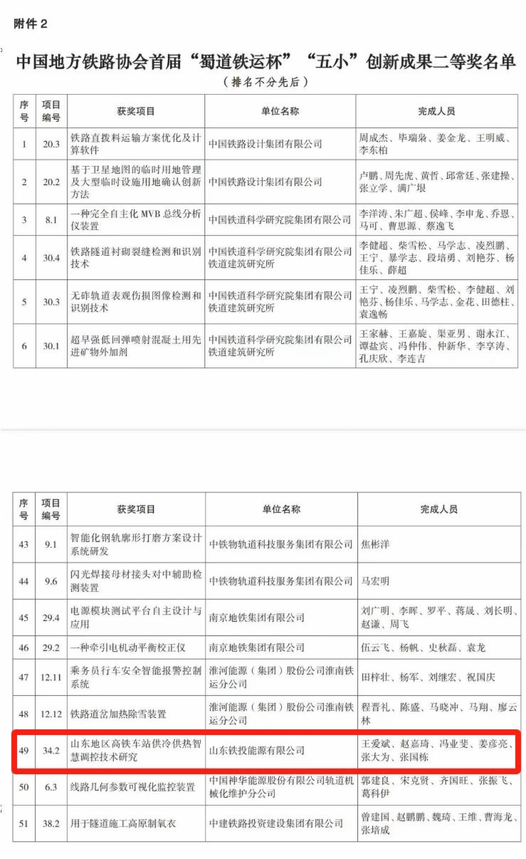 近日,山東鐵投能源公司打造的山東地區(qū)高鐵車站供冷供熱智慧調控技術研究項目獲得中國地方鐵路協(xié)會首屆“蜀道鐵運杯”“五小”創(chuàng)新成果二等獎,集團在科技創(chuàng)新應用方面再添新成果。