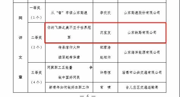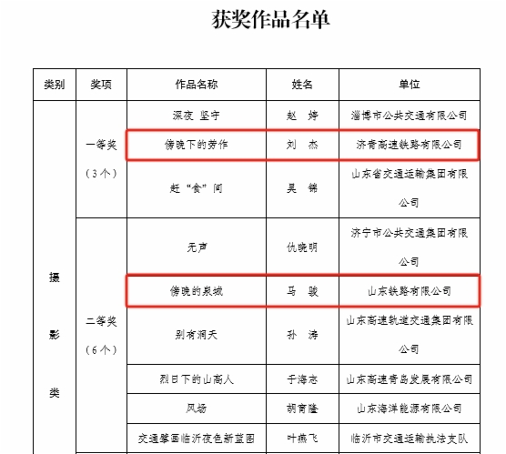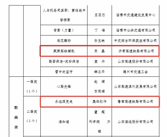 在“網(wǎng)聚職工正能量 爭做中國好網(wǎng)民”新媒體原創(chuàng)作品評選中,濟(jì)青公司劉杰同志《傍晚下的勞作》榮獲攝影類一等獎;鐵路公司馬駿同志《傍晚的泉城》榮獲攝影類二等獎;濟(jì)青公司宋磊同志《萊榮高鐵鋪軌》榮獲攝影類三等獎;魯南公司集體創(chuàng)作《永遠(yuǎn)跟黨走》榮獲歌曲類二等獎;魯南公司董星辰同志《我是第一書記》榮獲微視頻類三等獎;基金公司集體創(chuàng)作《破圈》榮獲誦讀類二等獎;鐵路公司沈?qū)氂淹尽赌愕娘w奔之美不亞于世界冠軍》榮獲網(wǎng)評文章類二等獎。