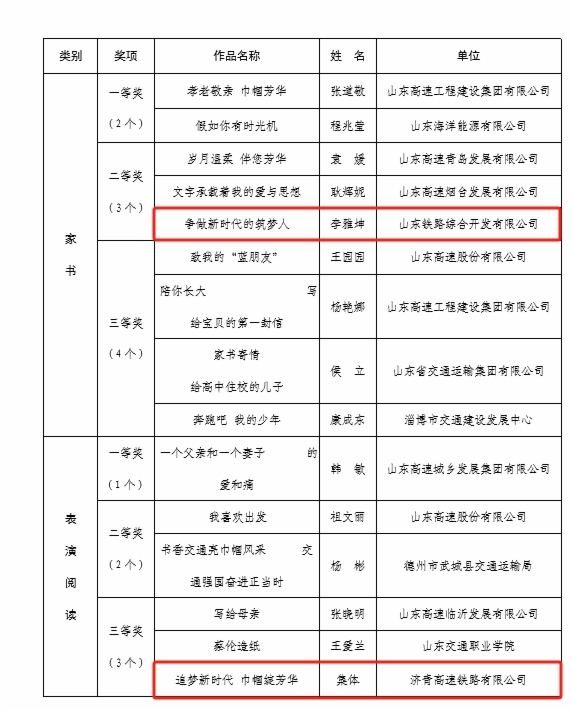 在“書香三八”讀書活動評選中,魯南公司袁夢陽同志《傳承巾幗奇志花開魯南騰飛》榮獲征文類一等獎;魯南公司王靜同志《梅花香自苦寒來--記共產(chǎn)黨員、高級工程師時小梅 》榮獲征文類三等獎;綜合開發(fā)公司李雅坤同志《爭做新時代的筑夢人》榮獲家書類二等獎;濟(jì)青公司集體創(chuàng)作《追夢新時代 巾幗綻芳華》榮獲表演閱讀類三等獎。