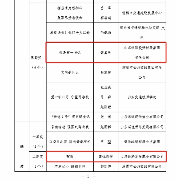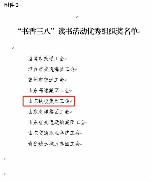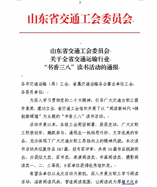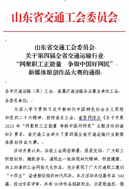 近日,由山東省交通工會舉辦的“網(wǎng)聚職工正能量 爭做中國好網(wǎng)民”新媒體原創(chuàng)作品大賽和“書香三八”讀書活動評選結(jié)果揭曉。集團(tuán)工會選送的11個作品獲獎,集團(tuán)工會榮獲兩個活動優(yōu)秀組織獎,受到省交通工會通報表揚。