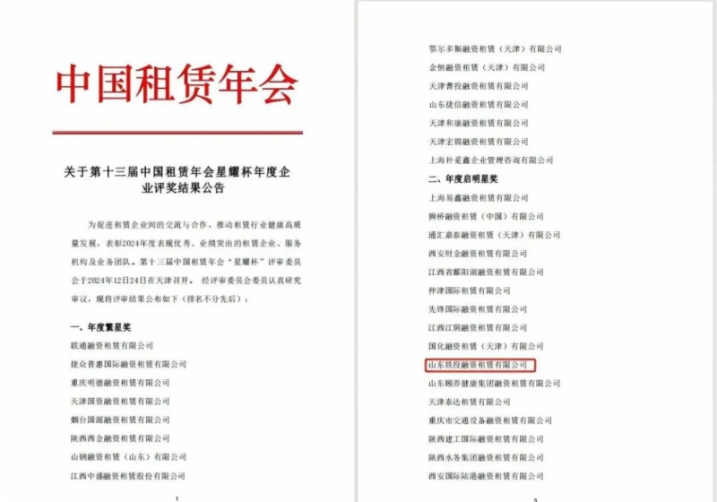 近日,在第十三屆中國(guó)租賃年會(huì)“星耀杯”年度企業(yè)評(píng)選中,山東鐵投集團(tuán)所屬鐵投租賃公司斬獲“年度啟明星”獎(jiǎng),該獎(jiǎng)項(xiàng)旨在突出企業(yè)實(shí)施戰(zhàn)略轉(zhuǎn)型期間,對(duì)行業(yè)具有影響力和貢獻(xiàn)力,能夠樹(shù)立良好榜樣的企業(yè)。這也是鐵投租賃公司2024年度繼獲得山東省融資租賃公司“高質(zhì)量發(fā)展獎(jiǎng)”榮譽(yù)稱(chēng)號(hào)后,獲得的第二項(xiàng)年度榮譽(yù)。
